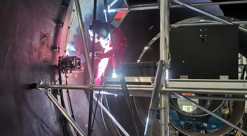 熊谷智能焊接机器人用于管板焊接作业时,搭配焊机采用药芯丝气保焊进行填盖操作,通过遥控器可实时查看焊接熔池情况。