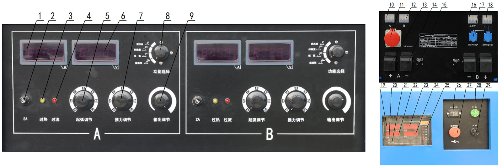◆ 1、电流表 2、保险管 3、过热指示灯 4、过流指示灯 5、起弧调节旋钮 6、电压表 7、推力调节旋钮 8、功能选择开关 9、输出调节旋钮